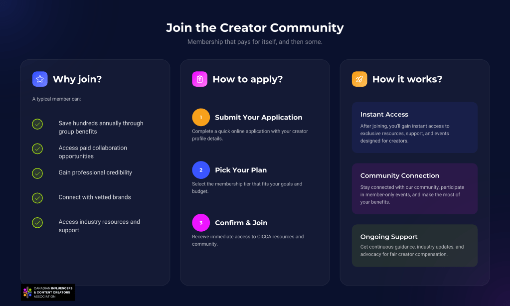 Joining the Canadian Influencers & Content Creators Association is simple. Gain access to exclusive benefits, industry support, and a thriving community of like-minded creators.